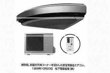 | 特徴 | 住宅のリビングルーム用として天井コーナーに据え付けできる新形態(扇形)のエアコン(業界初)。部屋の天井コーナーから部屋の中央に向けて、包みこむような暖房気流を送り出すことにより、快適な本格リビング空調を実現した商品です。 |