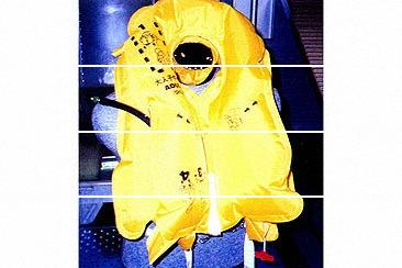 緊急時に、搭乗員の指示にしたがって乗客用として使用する。また手動膨張装置が付いており炭酸ガスシリンダーを膨張させて使用する。 |