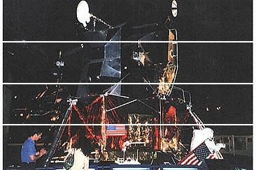 | 特徴 | このアポロ月面探査船は、人類を月面に送り込んだ最終の17号をモデルに組み上げられたものである。この外壁に貼り付けてある金色・銀色・銅色に輝くシートは、実際に使用されている素材と同一の素材で、梯子の下に取り付けてあるプレートには、当時のニクソン大統領とアポロ11号の搭乗員の署名が記載されている。周囲に配してある様々な計測機器をつなげているケーブルコードはアポロ計画で予備材料として保存してあったものを使用している。 |