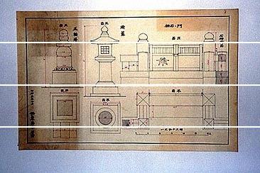 中橋徳五郎墓所 門・石柵正面・平面:燈籠正面・平面、五輪塔正面・平面図 |