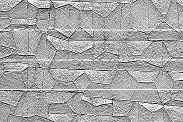 特徴 | 日本では高度成長期の住宅建設とアルミサッシの普及に伴い型板ガラスが普及した。特に1961年から75年頃までは「型模様戦争」と呼ばれる激しい販売競争により数十種の製品が出たが、殆どは1年程の短命であった。この製品もその一つで、護岸の積石や城の石垣を連想させる。 |