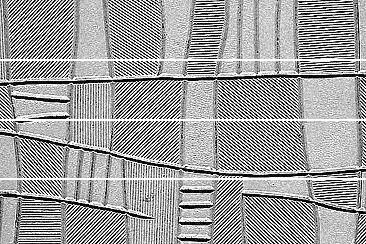 特徴 | 日本では高度成長期の住宅建設とアルミサッシの普及に伴い型板ガラスが普及した。特に1961年から75年頃までは「型模様戦争」と呼ばれる激しい販売競争があった。この製品もその一つで、田畑の中を歩くようなのどかなイメージであるが、実は外国の布地の柄がデザインのヒントになっている。他産業同士でデザインが影響しあうことはよくあるが、その一例。 |