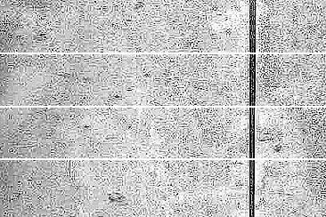 特徴 | 写真の中にある筋は、板引き法による製造時の不良の典型例。ガラスを引き上げるときのロールの傷やガラス生地内の不純物、失透などによって、このように筋が入ったり不透明になることがある。フロート法による現在は僅かな欠点でも工場内で廃棄されるが、板引き法では完全に欠点のないものは不可能で、欠点に応じてガラスに等級を付けて販売した。ガラスが高価であった時代や不足していた時代は建物内で等級を使い分けていた。 |
