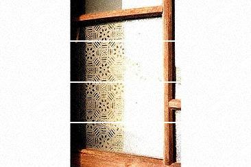 特徴 | 戦前は工賃が安いため、透明板に結霜や摺り加工を施して付加価値を付けたガラスが、高価な型板やエッチングガラスの代用品として普及した。加工法は海外からもたらされ日本で改良された。小紋ガラスはモスリングラスともいい、もともと輸入品であるが、日本では柿渋型紙を用いる江戸小紋の技法が応用されて明治期から国産化され、旭硝子でも作られた。亀甲、麻の葉など日本の文様も多く作られた。写真は諏訪の民家の実例。 |