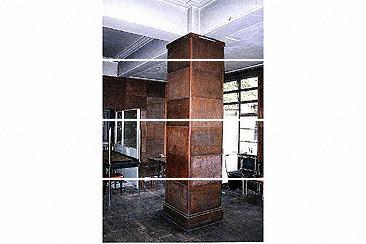 特徴 | 社交室内壁の木部仕上げには桜の合板が採用された。同潤会の江戸川アパートメントにおける先進性への取り組みは、この「狂わない、暴れない木材」としての新建材を用いるところにもよく現れている。仕様書には「羽目板は北海桜材合板とし、柱形の部分は厚一寸、他は厚五分、いずれも五枚矧ぎ以上のものとし、隙間なき様取り付くべし」とある。 |