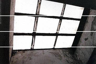 特徴 | 江戸川アパートメント2号館階段室吹抜部分の採光屋根装置である。坂本式は坂本商会、田中式は田中商会の採光屋根方式である。両者ともこの時代のトップメーカーであった。仕様書では「硝子葺装置は田中式又は坂本式とし、周囲枠は鉄アングルを用い埋込ボルトでコンクリートに取付け、硝子垂木は丁形鉄を約二尺間に配置し枠へ溶接又はアングル鉄を宛てカシメ付ける。硝子板は厚二分網入ガラスを嵌込み」とある。 |