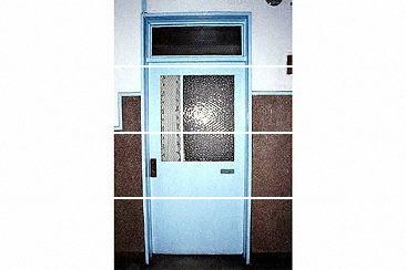 特徴 | 住戸玄関戸は引込戸と片開き戸の2種がある。これは引込戸で、日本建鉄DS型若しくは同等以上の類似型。戸の隅に郵便差入口があり、その内側には郵便受けとして木綿製の網がついていた。ガラスは大きな面は網入縞板だが、その脇を磨きの透明網入板とし覗き窓にしている。ここの上下にカーテンポールがあり、カーテンを張って視線を遮っている。当時は透明網入板ガラスはまだ量産されておらず、輸入品である。 |