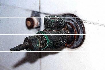 特徴 | 江戸川アパートメントの5階・6階は独身貸室になっており、各室に水まわりはなく、各階に共用の湯沸所が設置された。その壁には湯沸器として北辰商会製ジュピターオートボイラーW10号が2基設置された。この水栓はボイラーへの給水系統の痕跡で、上部にはボイラーへ向かう継ぎ手があり、先端には水量を調節するバルブのハンドルの軸が残っている。 |