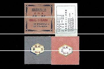 特徴 | 建材は部品化・工業化の流れの中で、建築や職人の手から離れて無名化し、個々の知識・技術に代わってカタログの「標準納まり図」が大きな役割をもつようになる。カタログは各時代の構法を知る有用な資料であるが、こうした企業の資料は滅失しやすい。最もポピュラーな新建材の一つ、石綿板製品の見本。 |