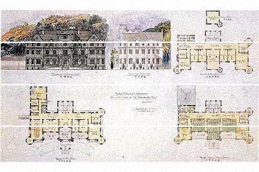 特徴 | 川崎芳太郎は川崎造船などを興した人物である。神戸の布引山下に計画された邸宅案で、和風部分は実現されたが、コンドルの手になる洋館は実現される前に施主も設計者も他界してしまった。全面石張りの外壁は、古河邸に見られるスコティッシュ・バロニアル様式をさらに本格的に展開した例である。コンドルは左右対照を基本としながらもそれを僅かに崩す構成を好んでおり、ここでもその手法が見られる。 |