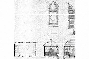 特徴 | 「教会(D)」は現存する建築図面からコンドルによる作品であることが知られているが、名称や設計時期が不明なため、仮称を用いてある。建物は木造で面積約10坪のごく小規模な教会堂である。図面から、独立した建物ではなく、増築、或いは付設されたものと考えられる。図面の裏側に「赤城下」と記された墨書があり、赤城下教会である可能性もある。しかし、この墨書がいつ記されたのか明らかでない。赤城下教会とは、地名「赤城下町(牛込区)」に由来するものであり、隣接する同区築地20番に在った聖バルナバ教会を指すものと考えられる。 |