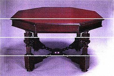 特徴 | テーブルの裏面に「二四年八月調ロ印二四号 三之内 鹿鳴館」と記されたラベルが貼られ、その下にさらにもう1枚ラベルが貼られているのが見える。そのデザインからも鹿鳴館で使用されたコンドルのオリジナル家具であることは間違いないであろう。鹿鳴館→華族会館→尚友会→尚友倶楽部と引き継がれたものである。 |