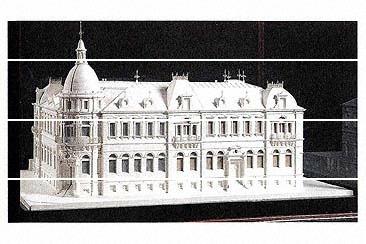 特徴 | 明治28年完成のルネサンス系のスタイルで、マンサード屋根と角の釣鐘形のドームが印象的である。当初は2号館全体を明治生命が使用していた。昭和9年の現明治生命館の完成し、2号館は解体された。その時、製作された模型である。 |