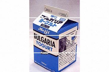 特徴 | 大阪万博のブルガリア館で紹介されたヨーグルトが開発の契機となり、1971年に国産初のプレーンタイプのヨーグルト「明治プレーンヨーグルト」が発売された。その2年後本場ブルガリアでその風味が絶賛されたことで、「ブルガリア」の名を使うことが許可された。ここに「明治ブルガリアヨーグルトプレーン」が誕生した。このゲーブル型紙容器は、現在使用している角形紙カップ容器に変更された1981年まで発表されていた。 |