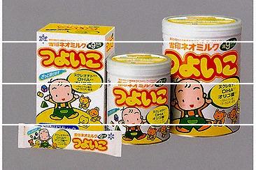 特徴 | 「雪印ネオミルクつよいこ」は2001年5月発売のフォローアップミルク。乳幼児の発育に大切なヌクレオチドを配合し、脳や網膜の発達に大切なDHA、β-カロチン、母乳オリゴ糖も配合している。また、牛乳と同等レベルまでカルシウムを強化し、牛乳では不足しがちなビタミン、ミネラルもバランスよく含まれている。 |