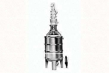 特徴 | ジャケット付重合反応槽で攪拌軸にリボン状攪拌翼を取付けその周辺に伝熱面を掻取る羽根を取付けることによって攪拌及び熱交換性能を飛躍的に高めた国産第一号機である。特に高粘性体の熱交、攪拌を伴う重合反応では反応時間の短縮、均質化がはかれた。シリコン系の重合等で500万CPの高粘性、又スラリー系のものに有効である。 |