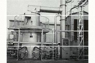 特徴 | 炉本体の上部から噴霧された廃液は、最下部にセットされたバーナーにより熱せられて、水分が蒸発し有機物は燃焼する。灰分は床に残るが未燃物は上昇して、スタビライザーの有る二次燃焼室に入る。スタビライザーは八方向にガスを出して旋回させる。左右対称にセットされた二次バーナーにより、完全燃焼させる。 |