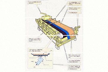 特徴 | 水平ベルト式の「住友の高効率真空フィルター」である。各種スラリーのろ過、脱水、ケーキ洗浄、スチーム乾燥等の操作を1台で連続的に行うことが可能であり、運転動力の低減、設備のコンパクト化等の多くの優位点がある。1975年に1号機を発表以来、樹脂スラリーや排煙脱硫副生石膏スラリー等の脱水機として、国内外で幅広く使用されている。 |