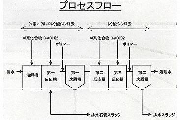 特徴 | 千代田の2段凝集沈殿処理法は、石灰焚火力発電所からの排水に含まれる有害微量成分、フッ素及びホウ素を処理するシステムである。第一工程でフッ素、第二工程でホウ素を凝集沈殿により除去する。消石灰法とAl系化合物の機能を合わせもった処理システムで、過剰なCo添加やAl添加が不要であり、汚泥発生量が少なく薬剤費も低減され、効率良くフッ素、ホウ素を除去できる特徴を持つ。 |
