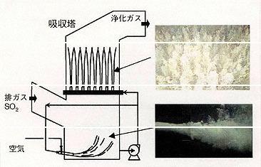 特徴 | 湿式石灰石膏法を用いた三菱排煙処理装置において、1990年代に開発した液柱式吸収塔及びそれに付随する水流酸化装置は、それ以前の排煙脱硫装置よりも優れた吸収・除塵性能を持ち、低コストかつメンテナンス性に優れている。今後、そのシンプルな構造による高い信頼性からも、米国、欧州、中国など海外へのプラントで更に本方式の採用が進んで行くことが期待されている。 |