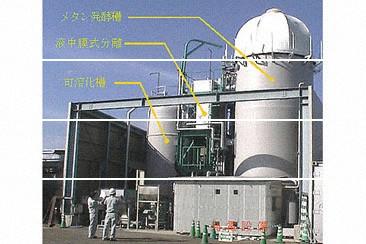 特徴 | 生ごみや食品廃棄物からバイオガスを取り出すシステム。独自開発の液中膜を導入する事により、メタン発酵槽内のメタン菌を高濃度に濃縮・維持することで設備の大幅な小型化、低コスト化を達成すると共に、膜分離により発酵阻害物質(アンモニア等)を除去することで、システムの安定性も大幅に向上。平成15年度新エネルギー機器の部の経済産業大臣賞受賞。平成17年現在、汚泥再生処理センター、自治体、食品工場向けに6施設が稼動中。 |