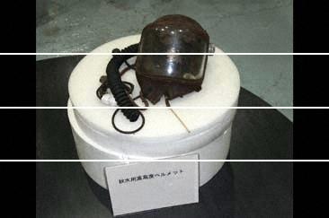 終戦間近に開発された局地戦闘機「秋水」はロケットエンジンで最大速度 900km/10000m、上昇力6000m/2分16秒、10000m/3分30秒、12000m/3分50秒で上昇するが、与圧装置は装備されておらず、急激に低温で、酸素濃度の低い高高度に達するため呼吸用酸素マスクが必要であった。本品は「秋水」用に開発された高高度ヘルメットで顔面はヒータ用ニクロム線の入った強化ガラスで視界を確保し、頭部は皮革で覆い、与圧用酸素パイプ、呼吸用酸素パイプが接続され、そこから胸部加圧袋に連結するゴム管が取り付けられている。また、耳部には受信用マイクがセットされている。 |