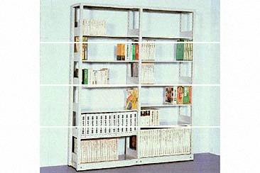 特徴 | 鋼製書架・シェルビング。1.B5からコンピュータファイルサイズ迄の書籍・ファイルを収納。2.病院向けとして、カルテ・レントゲンフィルムも収納可能。3.磁気テープ・カートリッジケースも収納可能。4.単式から複式又横連結により増連も可能。5.書架を移動台車に積載する事により、移動ラックへの転用も可能とし、収納効率を考慮した製品。 |