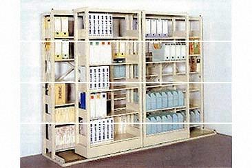 特徴 | 並行式移動ラック。壁面スペースを有効に無駄なく使え、ラックを前後に配列し、固定棚2台と移動棚1台より何連でも可能である。移動棚は良質のベアリングを取り付けてあるので、左右に軽く動き後列の書類も楽に出し入れできる。 |