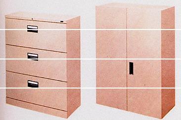 特徴 | 金属製の保管庫としてはファイリングキャビネット等の単体置きの什器を並べていたが、上部に引違いや扉付きのユニットを配置し、下部にラテラルキャビネットを配置、それぞれのユニットを連結して天井までの隙間を上部カバーでふさぎ、壁面収納家具のジャンルを開拓。現在当社のビジネスウォールN型に至る原型シリーズ。途中、扉部分にホワイトボードをスライドできるスライドボードを追加(省スペースに大きな板面を利用でき普及した。) |