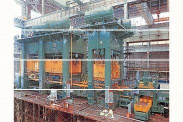 特徴 | 絞り工程を従来の複動プレスで成形して品質向上を図ると共に、三次元トランスファプレスの省人、生産性を活かした世界初のコンビネーションライン。複動プレスで絞られたパネルはトランスファプレスの前工程に位置するターンオーバ装置で反転された後トランスファプレスに送られ最終製品に仕上げられる。 |