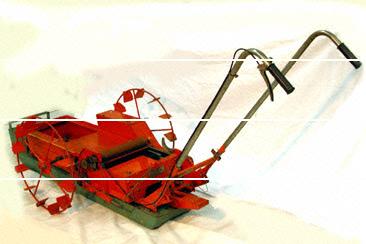特徴 | 田植えの機械化は昔からの夢であった。1960年代の経済の高度成長に伴う厳しい農村労働力の流出に対応して1965(昭和40)年ころから、官民あげて田植機の開発に取り組んだ。試作機はすべて歩行型で、使う苗は土付き苗や根洗い苗、挿苗は自然落下やピンセットによる強制植付けなど、多種多様であった。本機は、カンリュウ式農研号。帯状にした土付き苗を切り離しながら植える人力1条用の田植機で、市販田植機の第1号機である。 |