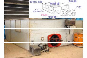 特徴 | 明治末期から乾燥機の研究が始まり、1923(大正12)年には、金岡式・三林式などの火力乾燥機が製作されている。また、昭和初期には共同利用の乾燥機の設置が奨励された。この機械は1958(昭和33)年ごろ、渡邊鉄四郎氏により考案された平型乾燥機である。装置は、四面を箱型に囲み、中段に金網を設けて、籾を堆積し、網下から送風機で風を送る。熱源を附加すれば温風を送ることも出来た。価格が安価で爆発的な普及をみた。 |