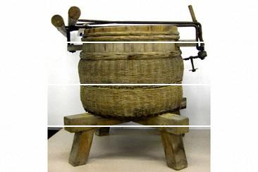 特徴 | 元禄時代に中国から伝来したと言われ、唐臼(からうす)ともいう。古来からの籾搗き作業による半搗米の食習慣が、この時代から土臼によるもみ摺りと杵搗きによる精米の2作業に分かれ、白米食が行われるようになった。土臼は、上臼と下臼で構成され、上臼の漏斗にもみを入れて、上臼を回転する。もみは、下臼との摺面に落下し、上下臼の狭い間隔の中で、もみを玄米にする。昭和初期に、ロール式籾摺機の普及により姿を消した。1940(昭和15)年頃まで使用。 |