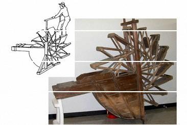 特徴 | 江戸時代(寛文年間(1665年)に大阪の農人京屋七兵衛・清兵衛兄弟により考案)にその原形があるが、明治・大正時代に用水路との段差のある水田地帯で用いられ、昭和初期(1925〜35年)まで利用された用具である。用水路、又はクリークに足踏揚水車を設置し、この車の上に人が乗り、羽根を足で踏んで車を回転させて水を汲みあげ、水田に灌がいする。 |