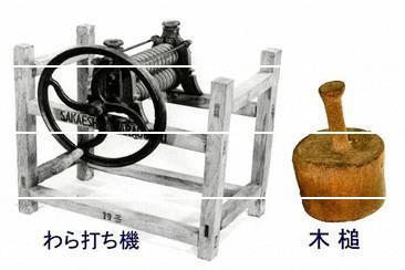 特徴 | 稲わら加工に用いるわらを柔軟にするための機具で、古くは石などにわら束を置き、木槌(写真右)を持って、たたき、柔軟にして利用した。昭和初期には、わら縄の需要が増大し縄ない機と共にわら打機が考案された。この機械は、手回しハンドルで2本のロールを回転し、わら束をロール間隙に通す。わらはその圧着力によって柔軟になり、加工用に適する状態になる。圧着力は押しバネで調節するようになっている。 |