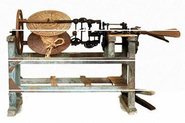 特徴 | 昭和初期(1925年頃)に考案され、農家の副業として広く利用された機械である。人力用のこの機械は、両足でペダルを踏み、2つのラッパ状のわら供給口に2~3本のわらを入れると「下より」がかかる。更に2本が組み合い、「上より」がかけられて縄になる。縄は巻き取り胴に巻かれて縄束になる。電動機の普及に伴って、縄の仕上げ面をよくする毛羽取り装置を付けて品質の向上が図られた。同型機は1933~1972年に使用。 |
