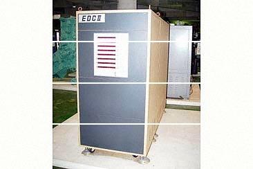 磁気バブル記憶素子として用いた世界初の本格的なデータベースマシン。EDCは、データベース操作用のマイクロプロセッサに磁気バブル記憶を統合した「磁気バブルデータモジュール」が並列に接続された構成の並列処理システムである。大型プロジェクト「パターン情報処理システム」のもとで開発された最新のマイクロプロセッサ、マイクロプログラム記憶、磁気バブル記憶を活用している。EDC試作機の内部は3×3の基本単位に分かれており、うち八つが各1MB容量の磁気バブル記憶を装備したデータモジュールである。1980年秋に、我が国で開催された世界コンピュータ会議(IFIP'80)および国際磁気バブル会議(ICMB-4)において、世界最高水準のデータベースマシン試作機として、国内外参加者に強い印象を与えた。 |