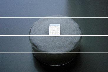 特徴 | 2種(AlGaAsとGaAs)の半導体結晶が薄膜状に高精度に積層させたものである。表面は電気特性測定のための金で覆われている。 |