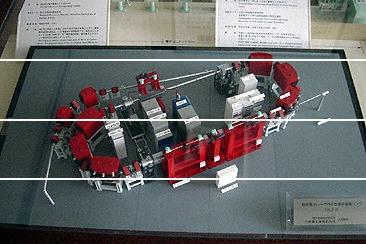 特徴 | 可視から紫外域の短波長自由電子レーザーの発振をめざし、電子技術研究所では住友電工_や川崎重工_と共同で1981年から1990年までの間に5種類の小型リングを開発した。写真の模型は5台目のもので、0.5GeVのレーストラック型リングと呼ばれ、このリングの直線部は紫外域自由電子レーザーを発生できるような設計がなされている。 |
