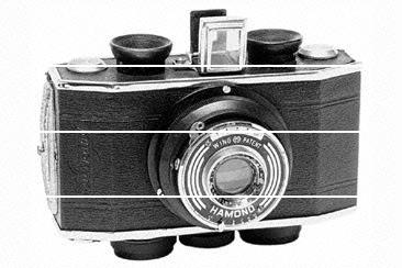 双眼鏡組込みカメラ。昭和13年12月発売。形式:特殊構造カメラ、感光材料:127フィルム、画面サイズ:30×40ミリ、価格:37円。 |