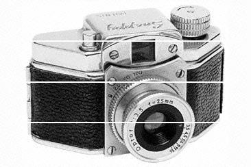 特徴 | ギロチン式シャッターを使用した極小型カメラ。この型のカメラとしては、レンズ交換式の本格的構造。昭和24年8月発売。形式:レンズシャッター式極小型カメラ、感光材料:裏紙付16ミリフィルム、画面サイズ:14×14ミリ、価格:1,780円。 |
