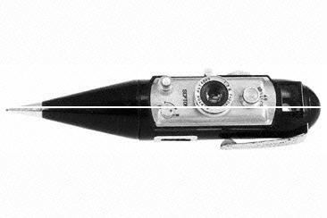 シャープペンシル組込みの極小型カメラ。昭和34年7月発売。形式:特殊構造カメラ、感光材料:裏紙付16ミリフィルム、画面サイズ:12×13ミリ、価格:2,950円。 |