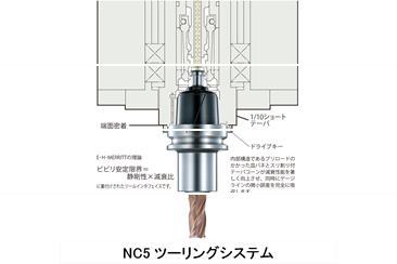 | 特徴 | 1995 年に(株)日研工作所が「NC5 TOOLING SYSTEM」として開発した1/10テーパー・中実 & テーパー・端面の2面拘束ツーリングシステムである。同時に、5倍の増力型クランプ・ロックの引込装置POWER5 SYSTEMも開発し、減衰効果 & 高剛性の次世代ツーリングシステムとして、特に自動車産業に普及している。 |