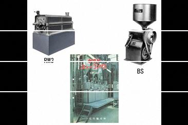 横型研削式精米機(RM)と横型摩擦式精米機(BS)を複数台連座したコンパス精米機(CP)は、昭和36年(1961年)当時としては全く新しい構想の精米装置であった。 |
