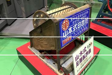 | 特徴 | 第一次世界大戦による農業の変化を敏感に感じ取った山本惣治郎によって、脱穀機「千歳式八枚胴稲扱機」、「千歳式、横綱号」が発売されたが、心棒と回転する胴とが密着していないため、音が大きく足で踏む労力も大きい欠点があった。写真は、心棒と回転胴部分にベアリングを入れる等の改良を施したことで、胴の回転を数倍に向上させ足踏みも軽快になり、評判を全国に轟かせた「山本式日吉号」である。 |