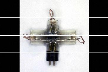 | 特徴 | ・4分割陽極をもつ小型のマグネトロン ・陽極の引出構造に特徴(均圧環をもたず、分割陽極に別々の引出線がある) 岡部のB形振動を発振させるため、分割陽極間に外部共振回路を接続できる構造と推定 ・試作管に近い少量生産品か? ・東京工業大学での使用経歴は不詳(均圧環の考案と何らかの関係があった可能性もある) (全長15cm) |