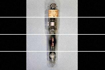 ・レーダー用パルス発振管の開発研究での試作管。 ・1μsのパルス発振を確認(陽極電圧20kV,4A,連続出力16W) (全長23cm,直径5cm) |