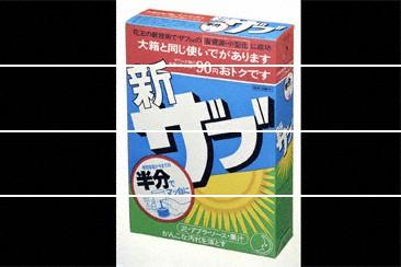 | 特徴 | 石油危機後,省資源と環境対策として、合成洗剤の濃縮小型化と低リン化が洗剤メーカーの大きな技術目標となった。花王では、この対応として、硬度の影響を受けにくい界面活性剤(AES)を用いた濃縮技術を確立した。1回あたりの標準使用量(25g/水30L)は、在来洗剤に比べ、容量で2分の1となり、「がんこな汚れが今までの半分の量でマッ白に洗える」というコンセプトの「新ザブ」を1975年7月に発売。 |
