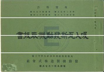 | 特徴 | 当社は明治40年の創業直後に吸入瓦斯発動機を製造販売した。この取扱書は、図面1枚と記事17頁にて構成され、燃料、発生器点火法、運転開始、運転中の注意及び運転終了、各部の掃除及び手入、機関室、等の項目に分けて解説されている。しかし、その殆どが瓦斯発生器に費やされており、発動機そのものの優秀さを物語るとともに、当時の燃料事情の悪さとガス取扱いの困難さを伺い知ることが出来る。 |